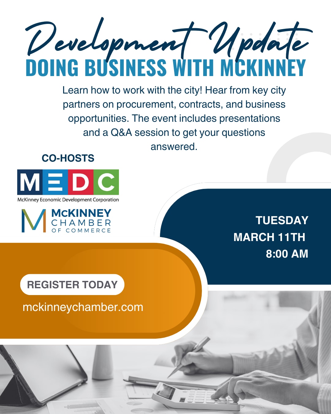 Join us for an informative session on "Doing Business with McKinney", where key city partners will provide valuable insights on how to navigate the procurement process, secure contracts, and collaborate with the city. This event will feature presentations from various city departments, each outlining their specific needs, requirements, and opportunities for businesses of all sizes. Whether you're a small business owner, entrepreneur, or established vendor, this session will equip you with the knowledge and resources needed to successfully engage with the city. The program will conclude with a Q&A session, allowing attendees to ask direct questions and gain clarity on the process. Don't miss this opportunity to connect, learn, and position your business for success!