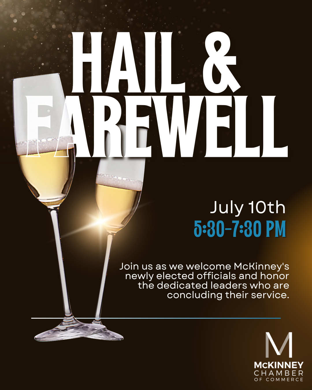 Join us for a special evening honoring our outgoing public servants and welcoming newly elected leaders. This event celebrates the dedication of those who have served our community and provides an opportunity to meet and connect with the incoming officials shaping McKinney's future. Enjoy refreshments, networking, and a program recognizing the contributions of our city's leadership. It's a meaningful occasion to express gratitude and foster relationships that support McKinney's continued growth and success.