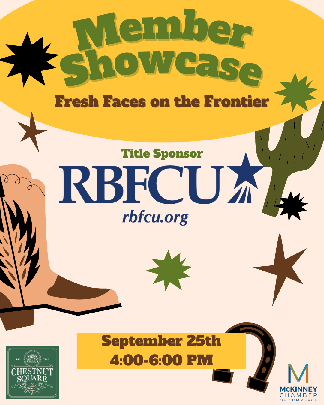 Come and go event! New Members (May-Sept 2025) Investor Partner and Above- Included with Membership New Members (May-Sept 2025) Business Partner- $200 Attendance without exhibit table- FREE Join us for appetizers and happy hour and get to know the New Members of the McKinney Chamber of Commerce! Exhibit Tables are available to new and renewing members who joined between May-September 2025 Investor Partner and Above- Included with Membership Business Partner- $200 Attendance without exhibit table- FREE Please contact Penni Goodpasture (pgoodpasture@mckinneychamber.com) to register for your table. 🏆 Networking Bingo: Get ready to mingle and make new connections with our Networking Bingo! Each bingo card is your passport to meeting and networking with fellow attendees. Visit each table to mark off your card as you connect with new members and discover shared interests. Keep the excitement going with our door prize drawings! Simply turn in your completed Bingo cards once completed to enter the drawing and increase your chances of winning. Best Decorated Exhibit Table: Saddle up and mosey on over to our western-themed showcase! Celebrate our New Members with decorations that capture the spirit of the Wild West—bold, rugged, and full of creativity. Transform your table into a cowboy's paradise or a frontier masterpiece that embodies the essence of western adventure. Bonus points for attendees who don their best cowboy hats, boots, and bandanas! 🎁 Prizes Await: The excitement doesn't stop there! We have a variety of prizes up for grabs, including rewards for the best-designed table with the theme, Bingo card winners, and our coveted business card drawing prize. With so many opportunities to win, the thrill never ends!