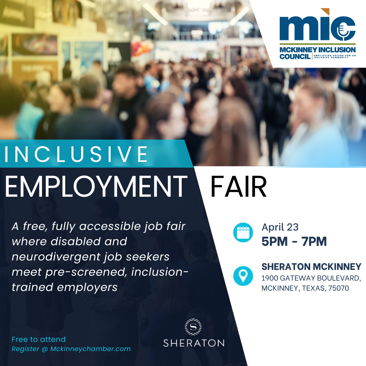 DESCRIPTION:MIC Inclusive Employment FairJoin the McKinney Inclusion Council (MIC)\, a program of the McKinney Chamber of Commerce\, for an evening focused on building a more inclusive workforce in our community.The MIC Inclusive Employment Fair is designed to connect local employers with neurodivergent individuals and people with disabilities who are exploring meaningful employment opportunities\, while also providing access to valuable community resources.The event will begin with a brief\, 30-minute educational session for employers\, offering practical insights on inclusive hiring practices\, workplace accommodations\, and strategies for supporting diverse talent.Following the session\, attendees will have the opportunity to engage in a structured employment and resource fair\, featuring:Employer Exhibitors sharing job opportunities and career pathwaysResource Exhibitors providing support services such as workforce development\, accommodations guidance\, transportation\, and moreThis event is designed to create a welcoming\, structured environment where job seekers can comfortably explore opportunities and where businesses can learn and connect in a meaningful way.Who Should Attend:Individuals seeking employment opportunitiesNeurodivergent individuals and people with disabilitiesEmployers interested in inclusive hiringOrganizations providing employment and support services\n\nCost: Free to attend and participate