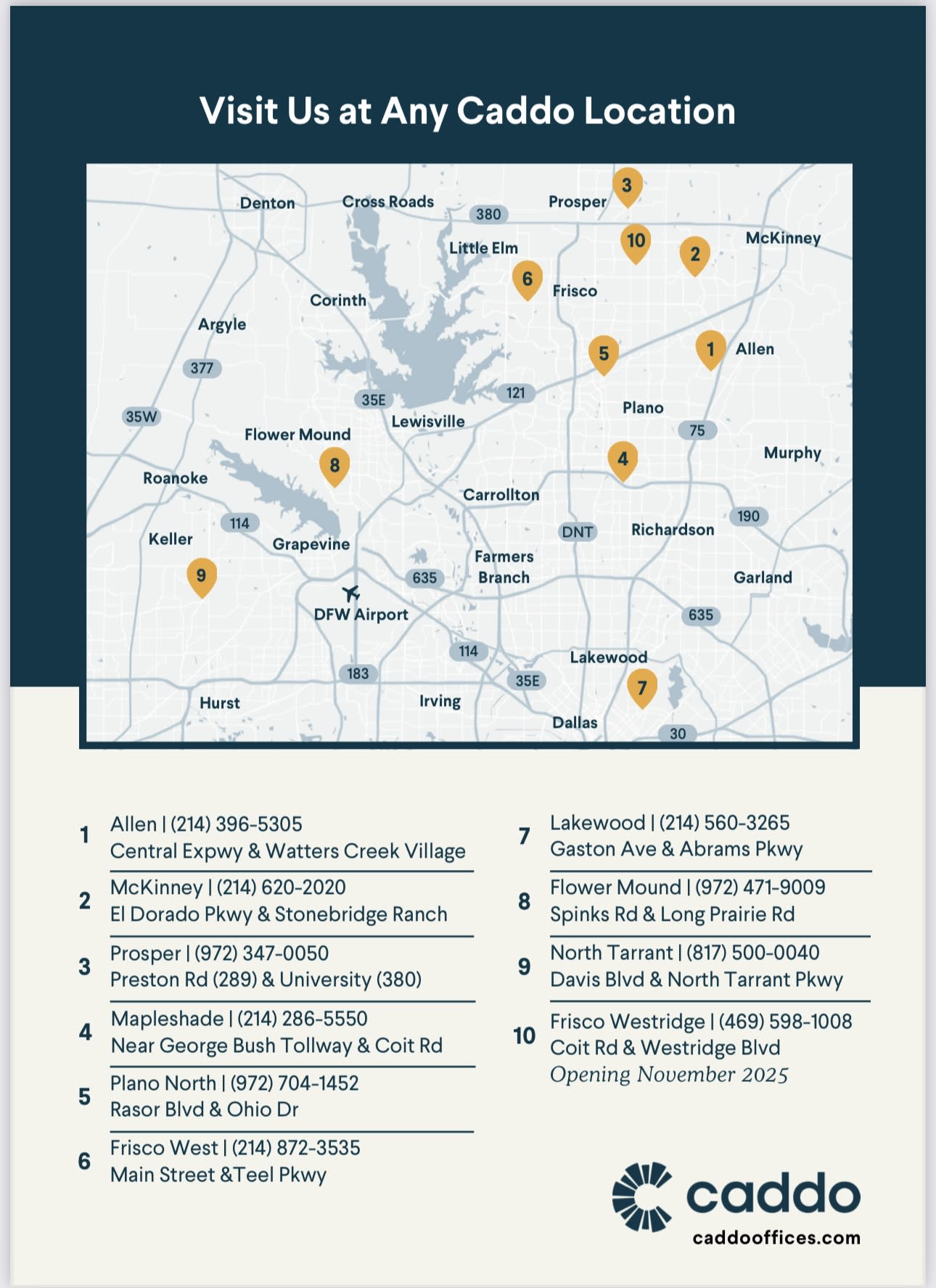 The first 40 people to sign a lease at Caddo Frisco Westridge will receive 20% off each month for 12 months on any suite lease! Contact Hayley at westridge@caddooffices.com Expiration Date : 11/17/2025